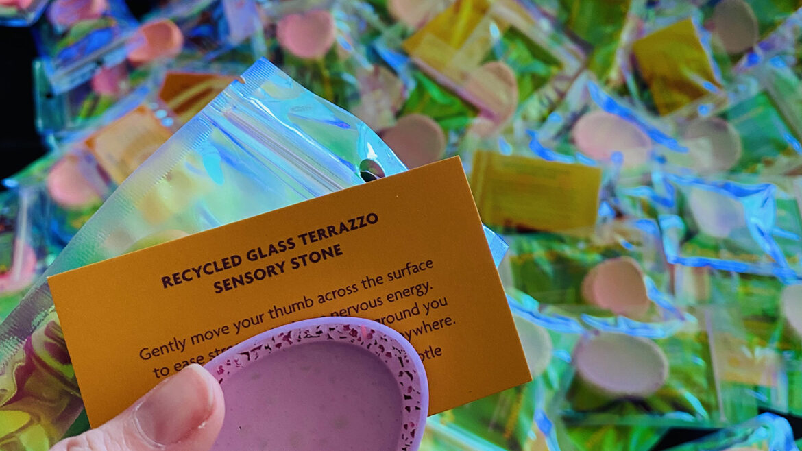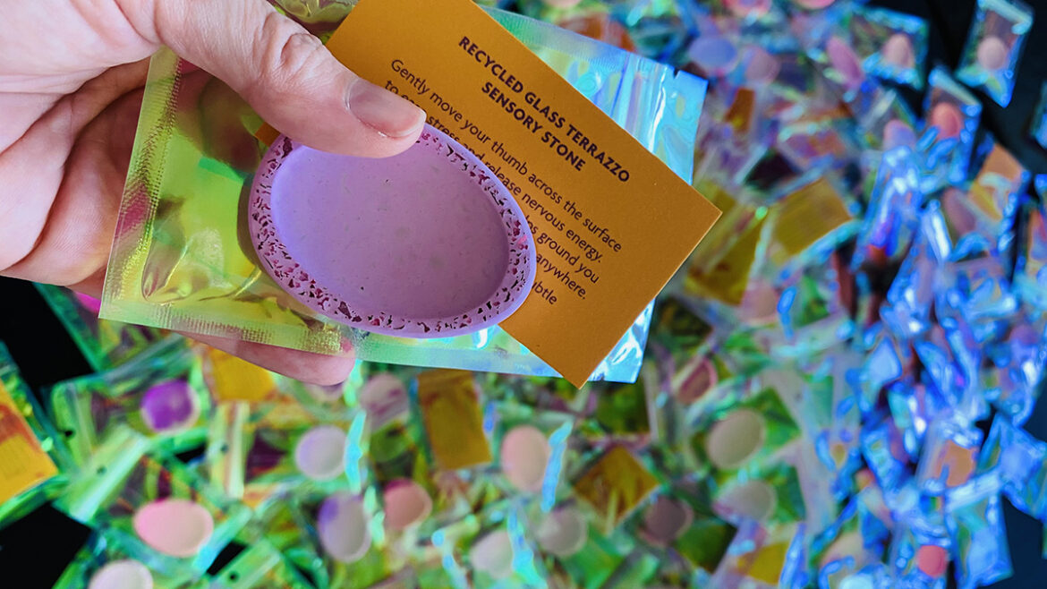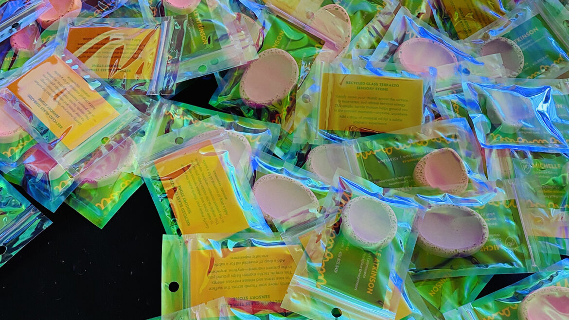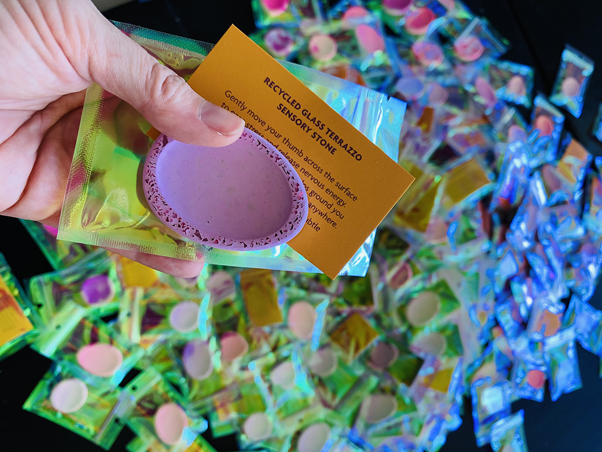 Example project - 300 giveaway items for conference attendees. The Sensory Stone is reminiscent of a 'worry rock.' Recycled glass has been added, and the edges sanded to give both the smooth texture in the centre and a rough feeling along the edges, adding to the sensory experience. Due to the porous nature of the 'stone', you can add a drop or two of essential oil to add an aromatic experience.