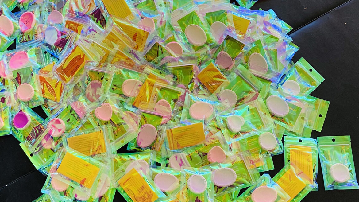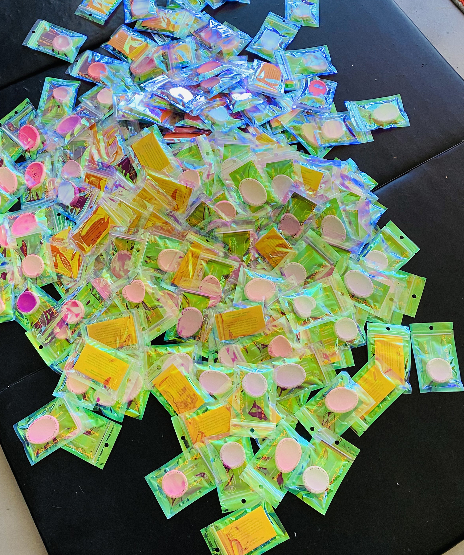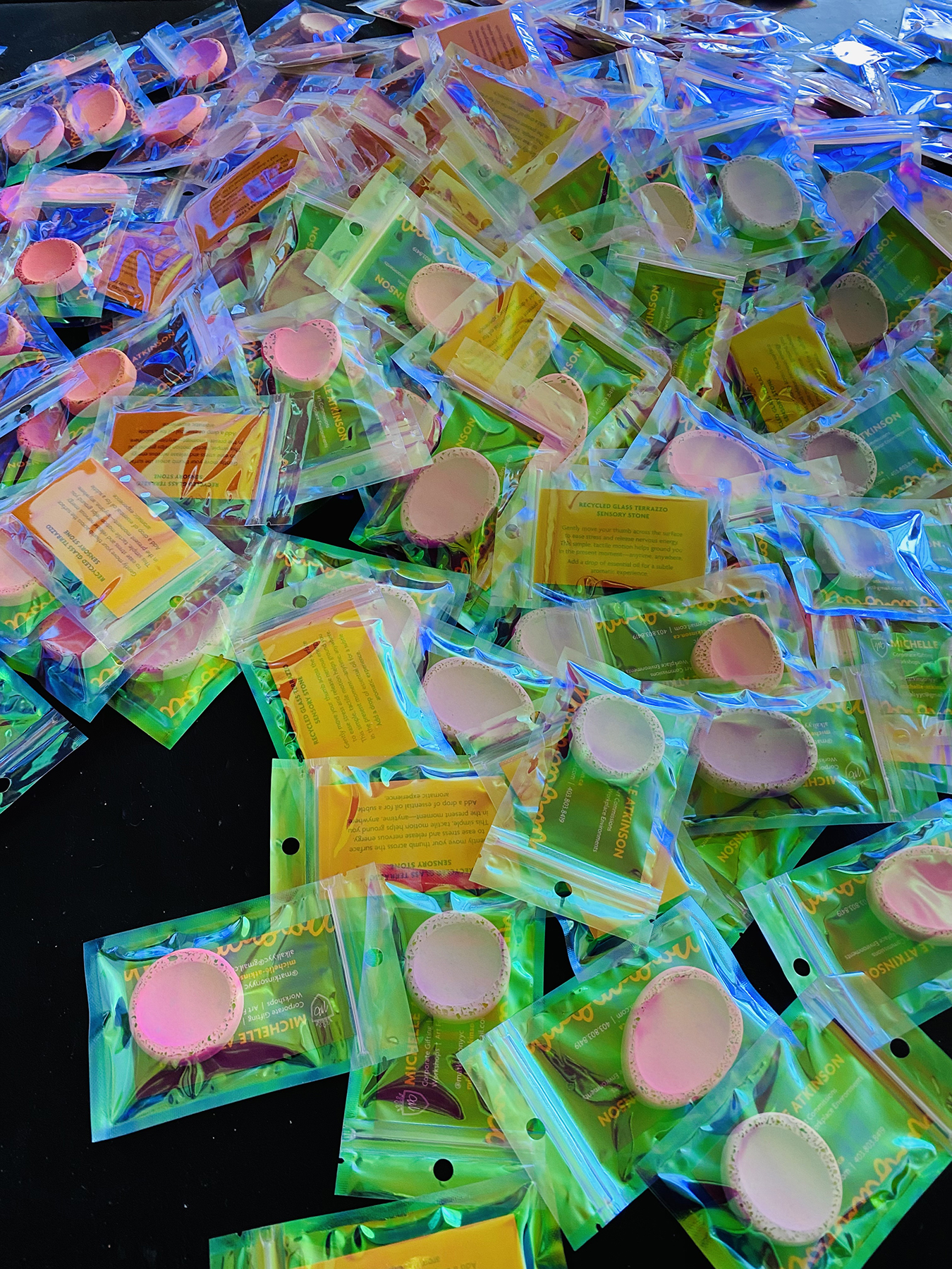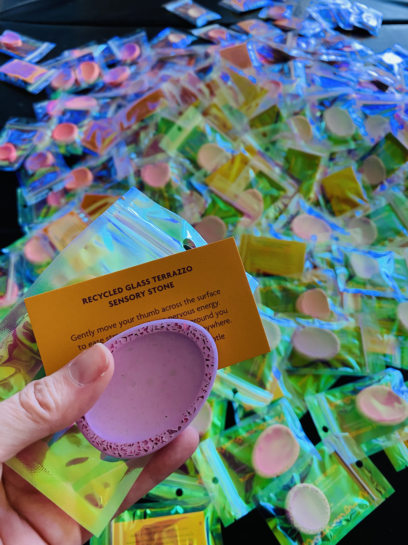 Example project - 300 giveaway items for conference attendees. The Sensory Stone is reminiscent of a 'worry rock.' Recycled glass has been added, and the edges sanded to give both the smooth texture in the centre and a rough feeling along the edges, adding to the sensory experience. Due to the porous nature of the 'stone', you can add a drop or two of essential oil to add an aromatic experience.