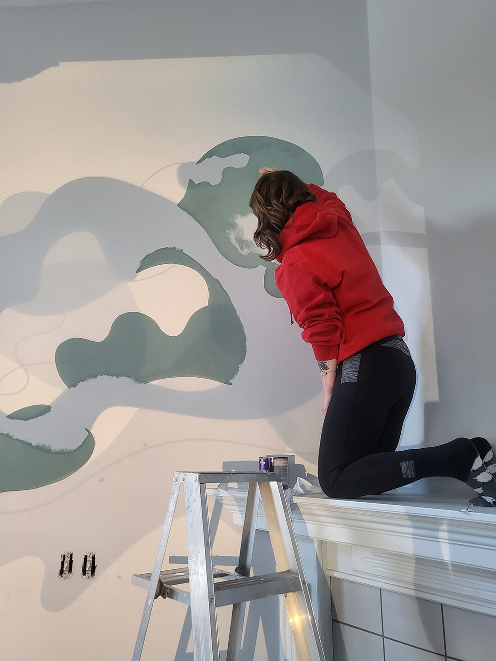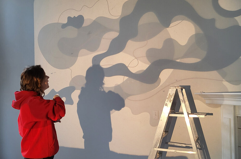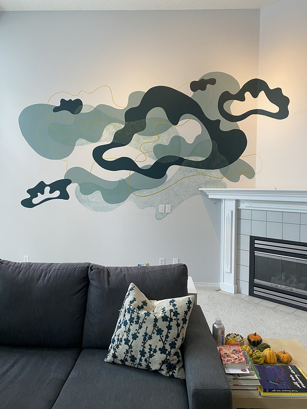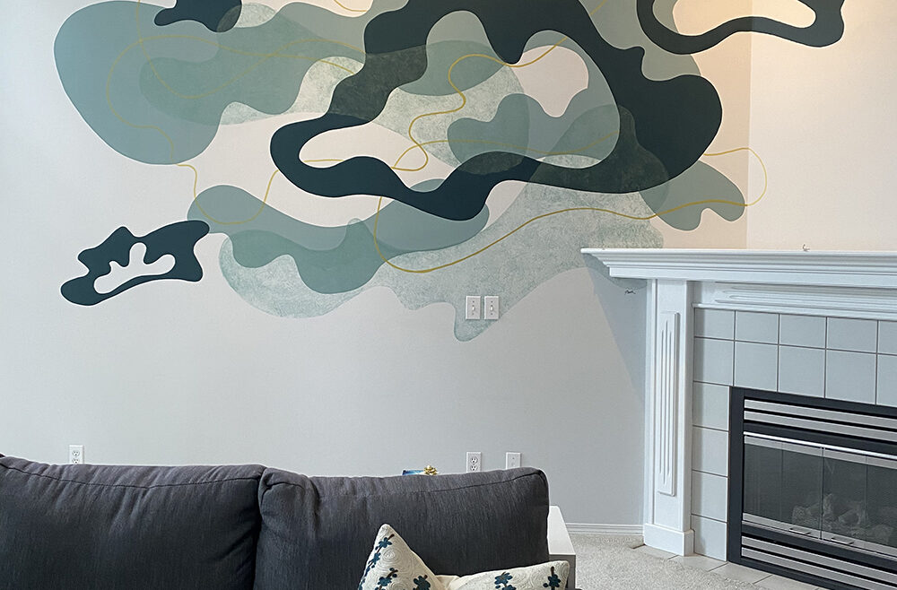 This custom mural was created for a friend’s home, transforming a soaring 15-foot wall into a luminous, one-of-a-kind artwork. The wall’s scale and openness demanded a design that would both anchor the space and create a sense of lightness—a balancing act that led me to a floating, cloud-like composition. The forms were generated using weather data from my friend’s birth date and location, a process I often use to weave personal history into visual form. This data, translated into curving, organic shapes, became the structural rhythm of the mural. Rather than presenting the data in a literal way, I allowed it to inform the flow and spacing of the elements, giving the piece both a scientific underpinning and an emotional resonance unique to its owner. The color palette was chosen in collaboration with my friend, reflecting her love of rich, grounding hues with a hint of opulence: soft teal greens and deep navies layered with luminous gold accents. The gold catches the light throughout the day, shifting from subtle warmth in the morning to a glowing highlight in the evening, adding a living quality to the wall. Executed entirely by hand, the mural’s painterly textures bring depth and dimension to the cloud forms, allowing them to drift visually across the wall. The result is a piece that feels expansive yet serene, infusing the room with an atmosphere of calm movement. Beyond its visual beauty, this mural serves as a deeply personal marker—an artwork anchored in a specific moment and place in time, yet expansive enough to feel timeless. It stands as an example of how my data-driven process can be adapted to large-scale, site-specific works that harmonize with the architecture and life of a space.