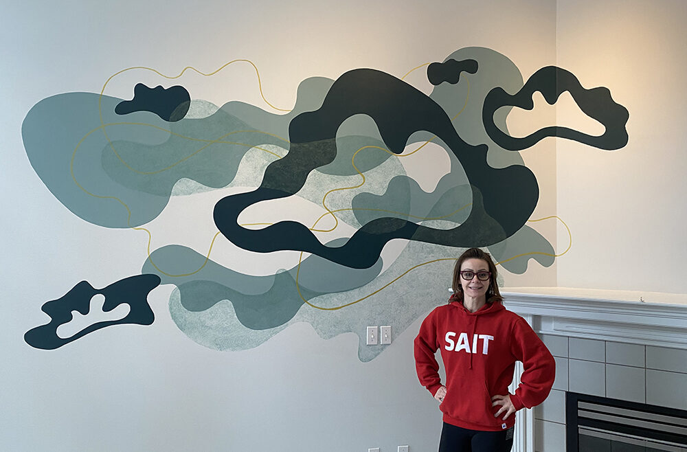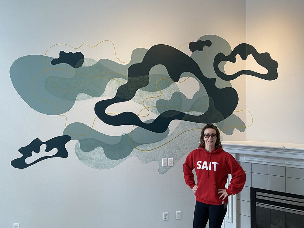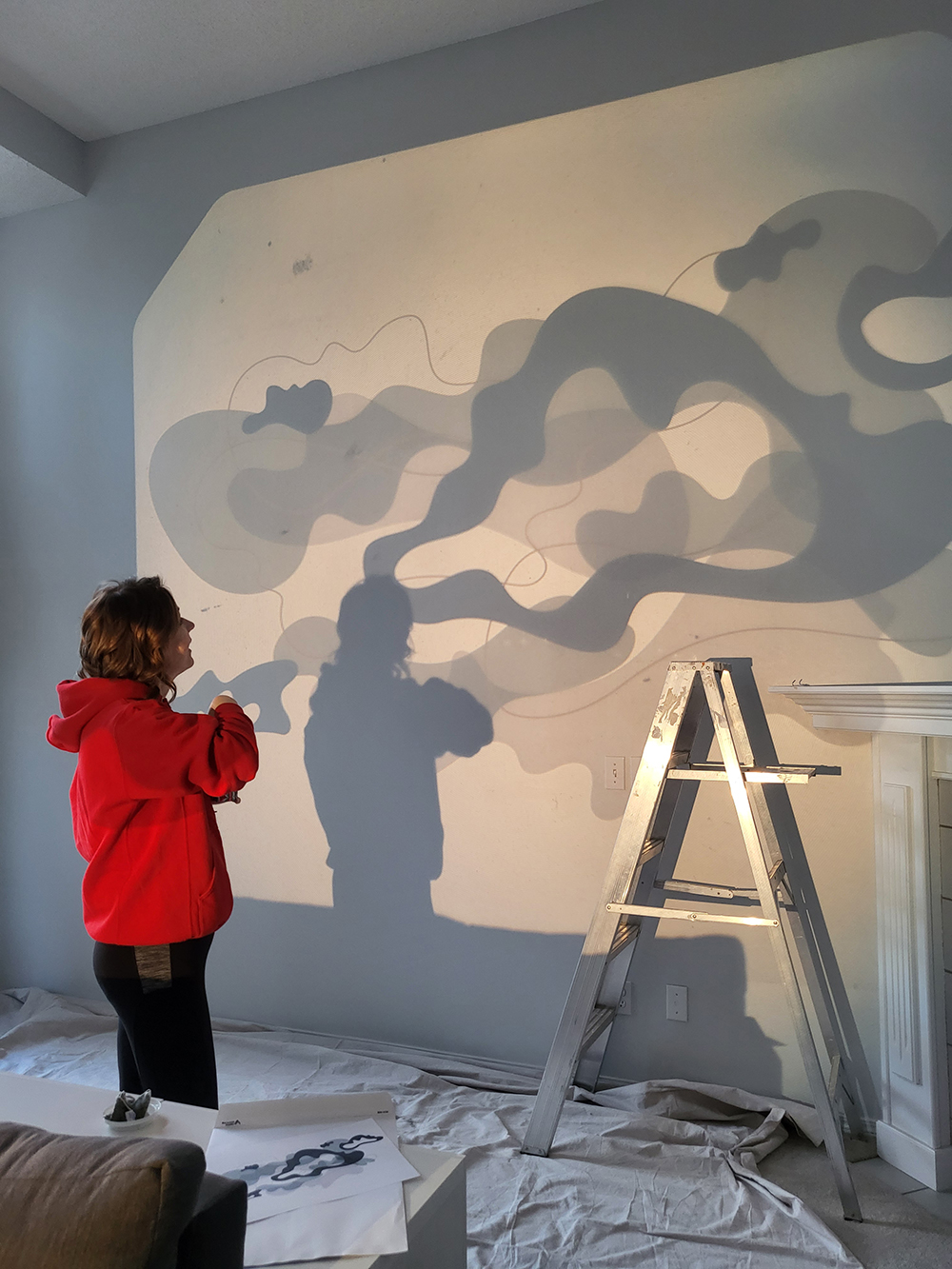 This custom mural was created for a friend’s home, transforming a soaring 15-foot wall into a luminous, one-of-a-kind artwork. The wall’s scale and openness demanded a design that would both anchor the space and create a sense of lightness—a balancing act that led me to a floating, cloud-like composition. The forms were generated using weather data from my friend’s birth date and location, a process I often use to weave personal history into visual form. This data, translated into curving, organic shapes, became the structural rhythm of the mural. Rather than presenting the data in a literal way, I allowed it to inform the flow and spacing of the elements, giving the piece both a scientific underpinning and an emotional resonance unique to its owner. The color palette was chosen in collaboration with my friend, reflecting her love of rich, grounding hues with a hint of opulence: soft teal greens and deep navies layered with luminous gold accents. The gold catches the light throughout the day, shifting from subtle warmth in the morning to a glowing highlight in the evening, adding a living quality to the wall. Executed entirely by hand, the mural’s painterly textures bring depth and dimension to the cloud forms, allowing them to drift visually across the wall. The result is a piece that feels expansive yet serene, infusing the room with an atmosphere of calm movement. Beyond its visual beauty, this mural serves as a deeply personal marker—an artwork anchored in a specific moment and place in time, yet expansive enough to feel timeless. It stands as an example of how my data-driven process can be adapted to large-scale, site-specific works that harmonize with the architecture and life of a space.